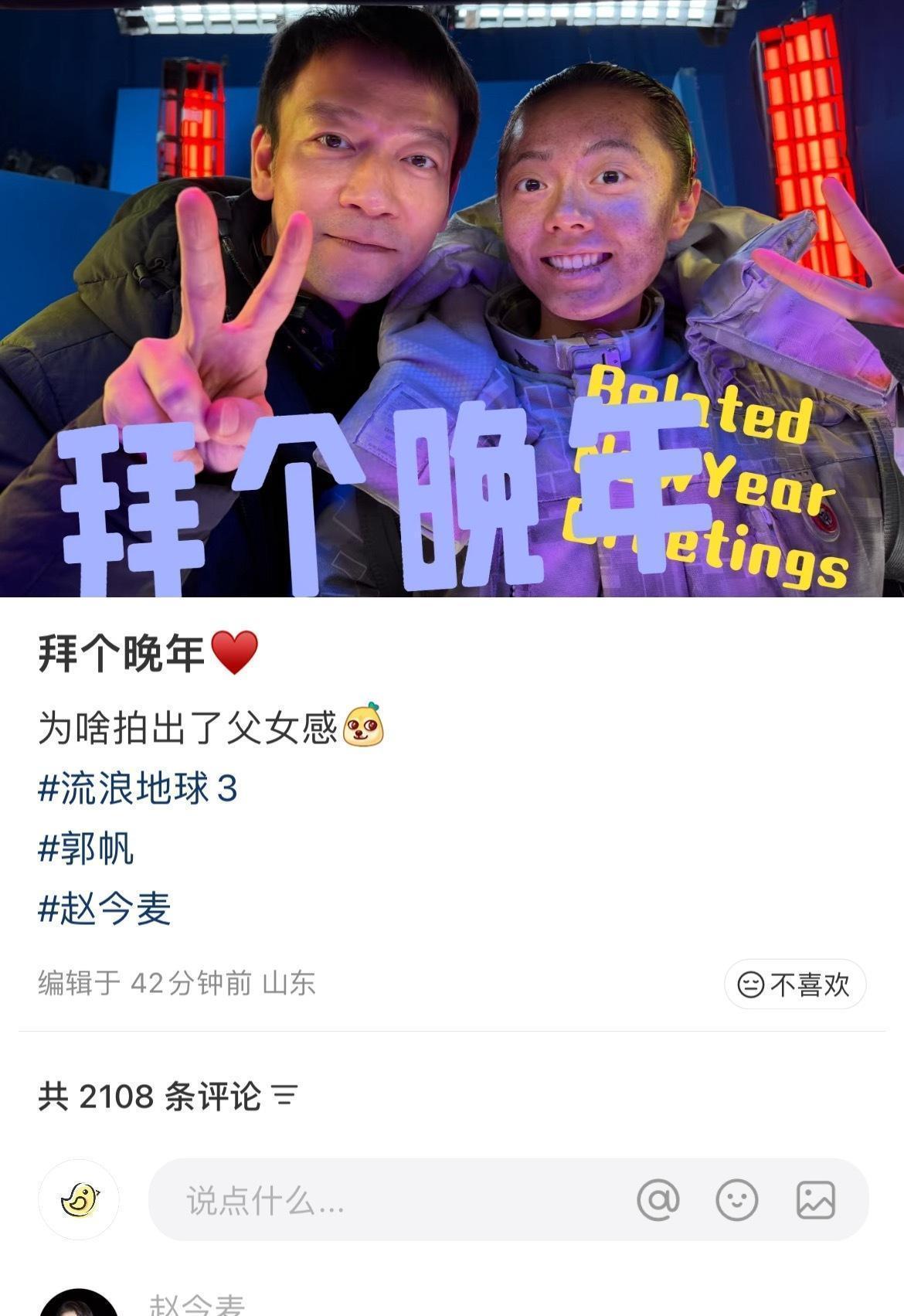 嗨!这里是娱乐寡姐,为你带来最新娱乐资讯。郭帆在社交平台上发了自己和赵今麦的合影,合照中的赵今麦太颠覆以往清纯甜美的形象,这应该是赵今麦饰演的《流浪地球3》韩朵朵造型,战损脏污的硬核末日风,引发网友对新剧情的好奇。